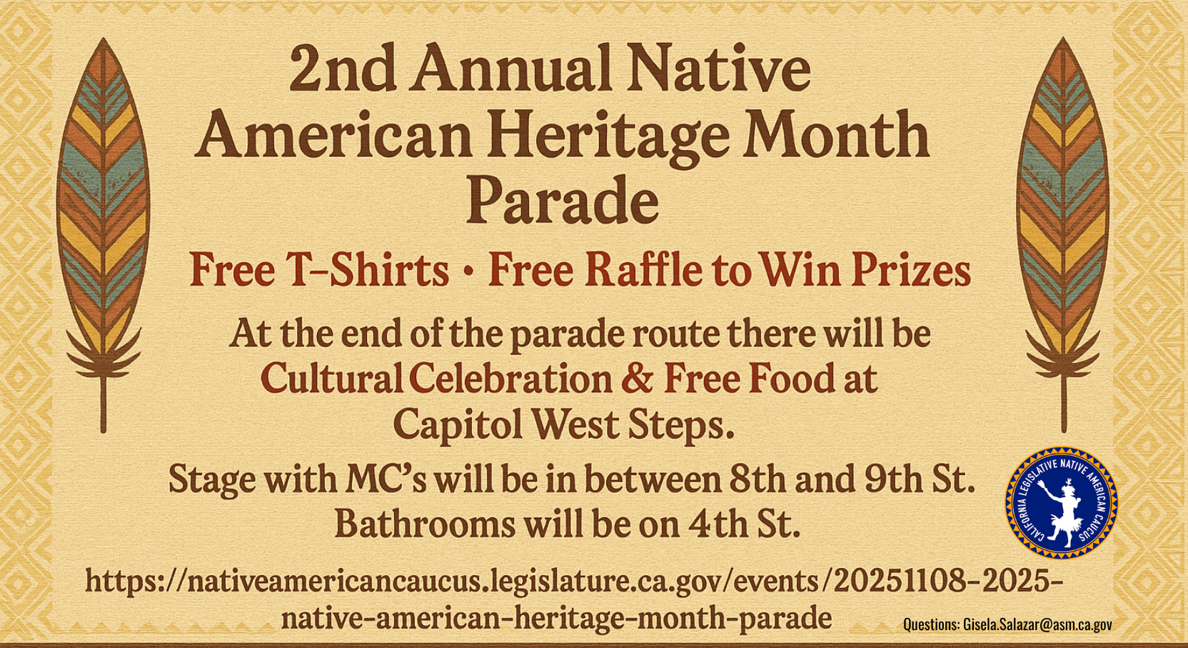 Join us for the 2nd Annual Native American Heritage Month Parade in Sacramento. The parade will showcase floats, vehicles, horses, marchers, and cultural performers in celebration of Native American heritage and culture. Register now if you’re interested in being part of the parade.If you have questions about the event, email linda.sacks@asm.ca.gov or call (916) 319-2045.Hope to see you there!Register NowView FlyerParade InformationParade Map Event Date Sat, Nov 8 2025, 10am - 3pm