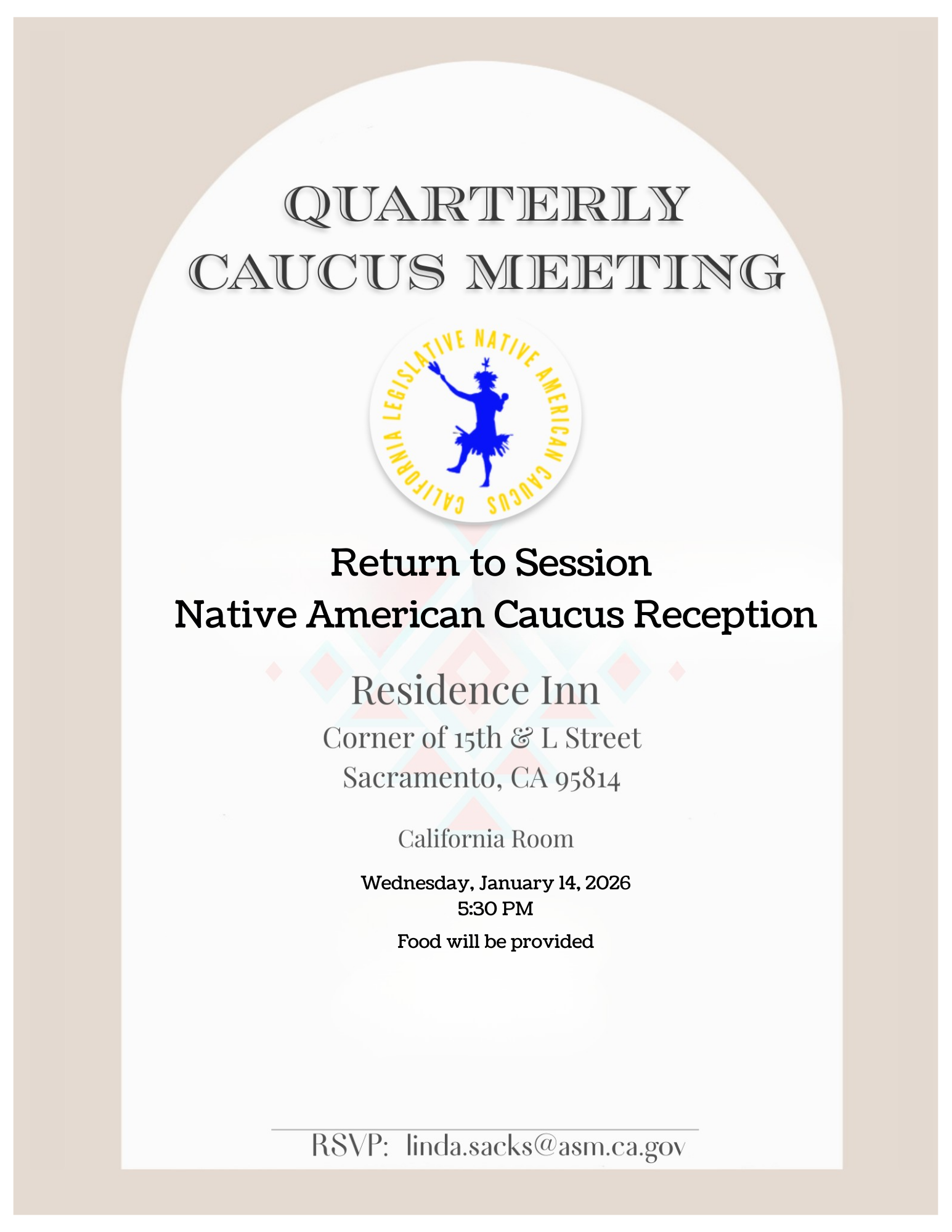 The Native American Caucus invites you to join us as we return to session for our quarterly caucus meeting reception. This gathering provides an opportunity to reconnect, build community, and engage in meaningful conversation at the start of the legislative session.Food will be provided.Wednesday, January 14, 20265:30 p.m.Residence Inn (California Room), located at the corner of 15th and L Street in Sacramento.To RSVP, or if you have questions about the event, please email [email protected]View Flyer Event Date Wed, Jan 14 2026, 5:30 - 7pm